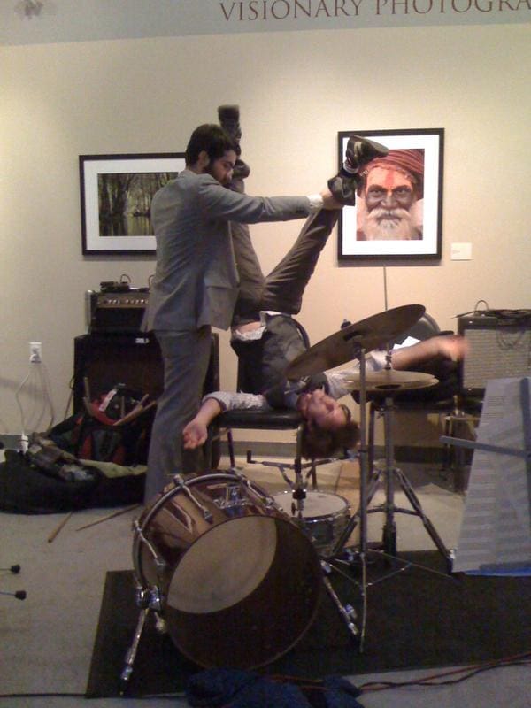 More goods out of New York: Puttin on the Ritz. If your a fan of the famed Rat Pack, you gotta check this shit it out! It’s raw, funny, jazzy, yet punk. Moonlighting between his day job on John Stuart’s Daily Show, lead singer (if that’s what you call it) put’s on his party suit at night when he fronts Puttin on the Ritz, alongside his band mate Kevin Shea, who also bangs it up in Talibam!, Great Lakes and Storm And Stress. Wanna hear some comical ruckess in classy attire, give these boys a listen and do it live. They sound as though Sinatra got into Sammy Davis’ fun bag o’ drugs, to the tune of some fucked up big band beats. If you’re lucky they just may have their xtended five-piece line-up (upright bass, trumpet and sax) in attendance.