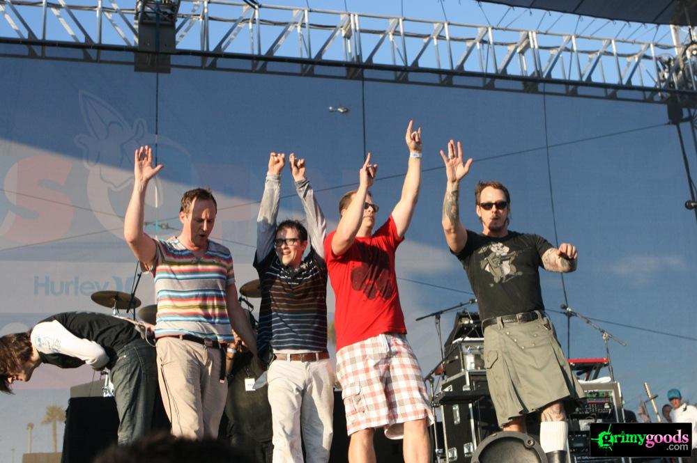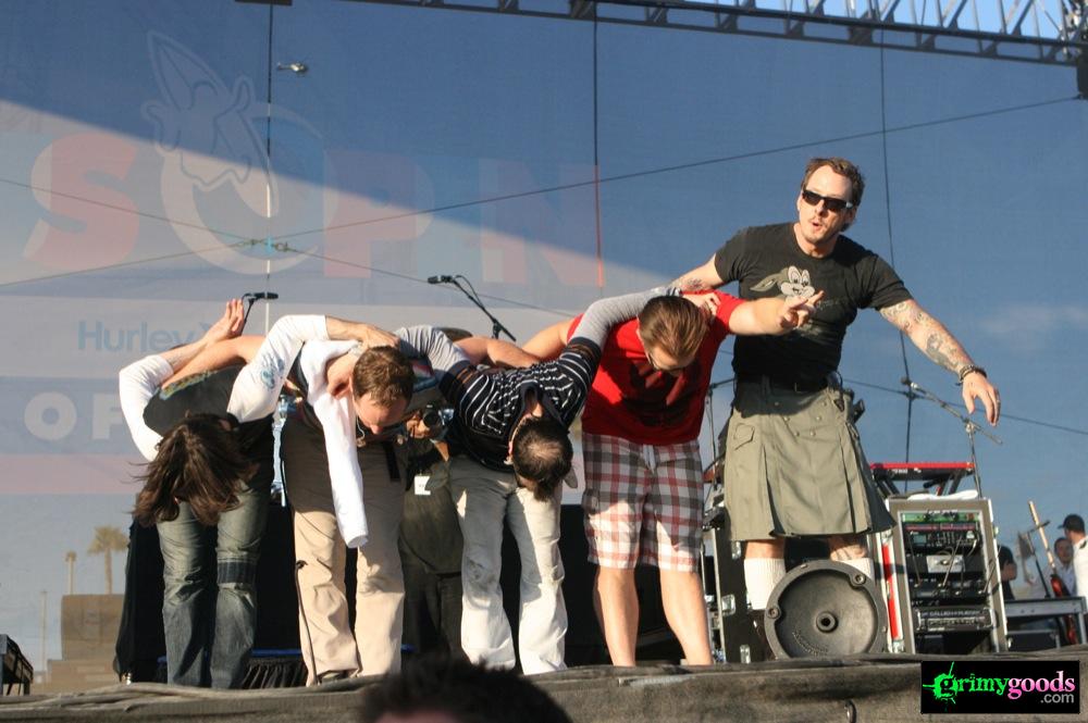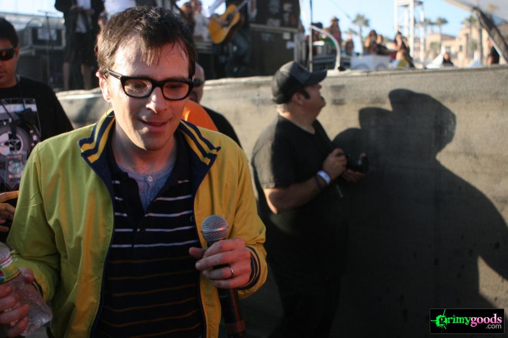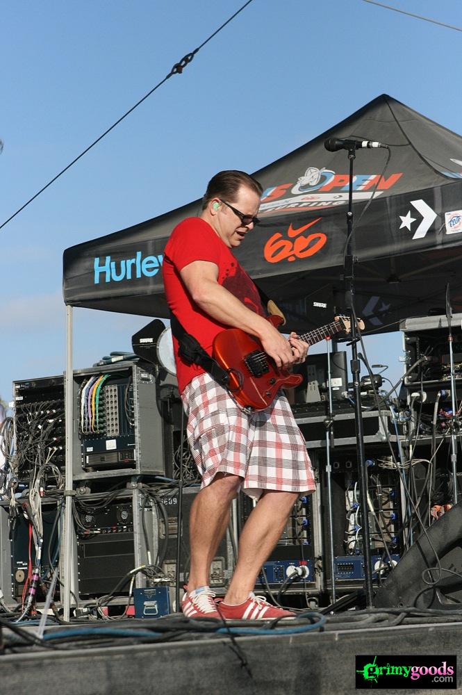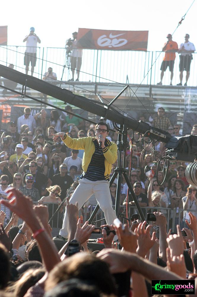 Recently signed to Epitaph, So Cal rockers Weezer put on a hell of a show last Saturday, Aug. 7, 2010 at the US Open of Surfing. Their set was full of unbelievable energy with their axe poses, stage jumping, crowd interaction, fashionable -or-not-so fashionable kilts (yes, like the kind Axl Rose used to sport), football passing, gansta-rapper-crotch-grabbing, onstage bikinis, Lady Gaga impersonations and so much more! Weezer with out a doubt put on an eventful show (a photog’s dream) and one that would definitely be hard to follow.