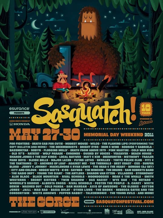 The 2011 Sasquatch! Music Festival line-up has been announced! This year’s Sasquatch! will take place Memorial Day weekend, May 27-30, 2011 at at the Gorge Amphitheatre in George, Washington and will feature: Guided By Voices, Death From Above 1979, Foo Fighters, Modest Mouse, Wilco, The Flaming Lips, Bright Eyes, Iron & Wine, Yeasayer, Sharon Jones & The Dap Kings, Deerhunter, Beach House, Sleigh Bells, MSTRKRFT, Sharon Van Etten, Aloe Blacc, Das Racist, White Demin, Secret Cities, Cotton Jones, Wolf Parade, Chromeo, Bassnectar, Alberta Cross, The Radio Dept., and many more!