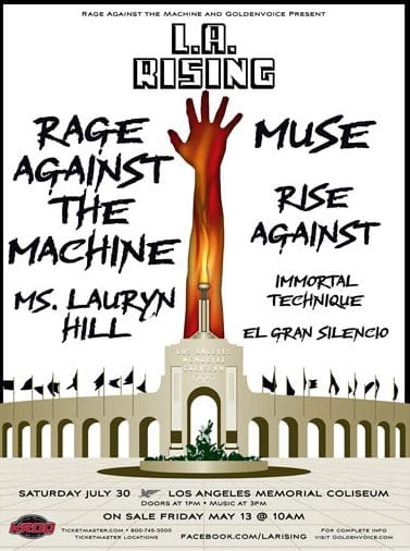 Now this shit is gonna be nuts and I’m giving it a big NO THANK YOU (although seeing Rage again would be righteous!). Bring out the riot gear! But, I know a lot of you wanna go to this big shabang and rightfully so! So here’s the presale info and password for L.A. Rising with Rage Against the Maching, Muse, Lauryn Hill, Immortal Technique, El Gran Silencio and more at the L.A. Coliseum!