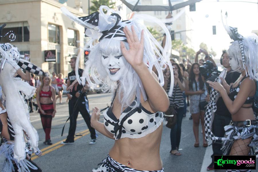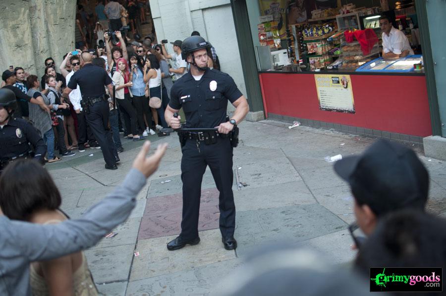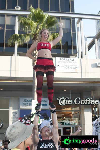 As I’m sure you have all by now heard (or experienced), last week there was quite the riot or shall I say “impromptu block party” for the world premiere screening of Electric Daisy Carnival Experience. But what really set this clusterfuck off was a Twitter announcement by superstar rave DJ, Kaskade who Tweeted a secret show in front of the Chinese Theater where the premiere was set to take place. Naturally, all the raver freaks and geeks came out to stir-up some madness. The end result was a fucked up event with Kaskade’s block party being the focal point. The red carpet pretty much got cancelled, the screening was practically empty and the afterparty with Kaskade’s “official” performance was a media nightmare. Guest lists were screwed and nobody really knew what the hell was going. Needless to say, our awesome photog weathered the storm and captured some pretty sweet photos. Check them out below.