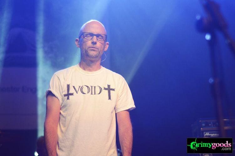 Enter surprise #1 – a very dapper Perry Farrell of Jane’s Addiction! When did he become so handsomely clean cut? He sang “Isolation” with gusto! His shimmy meets the robot dance moves and enthusiasm were well received too. During “Colony,” one of my favorite Joy Division songs, not-quite-so-surprise-guest Moby hit the mic (he had previously tweeted/facebook posted re: his guest appearance). In his own focused, pacing, trance-like way Moby brought some incredible raw energy to the stage. It was infectious and the crowd ate that shit up, including myself. He also sang “A Means to an End” and who fucking knew that Moby could rock so hard?! Afterwards he was gracious enough to thank everyone for letting him participate.