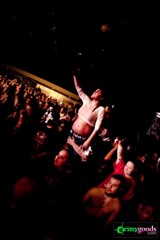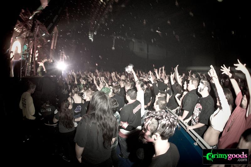 Walking into the venue was just as we expected: a bunch of white kids that look like their from Middle America—some with clown paint across their faces, some not-so-classy chicks in their bras and a bunch of ghetto lookin’ kids in saggy pants, baseball caps and of course plenty of Psychopathic Records attire.