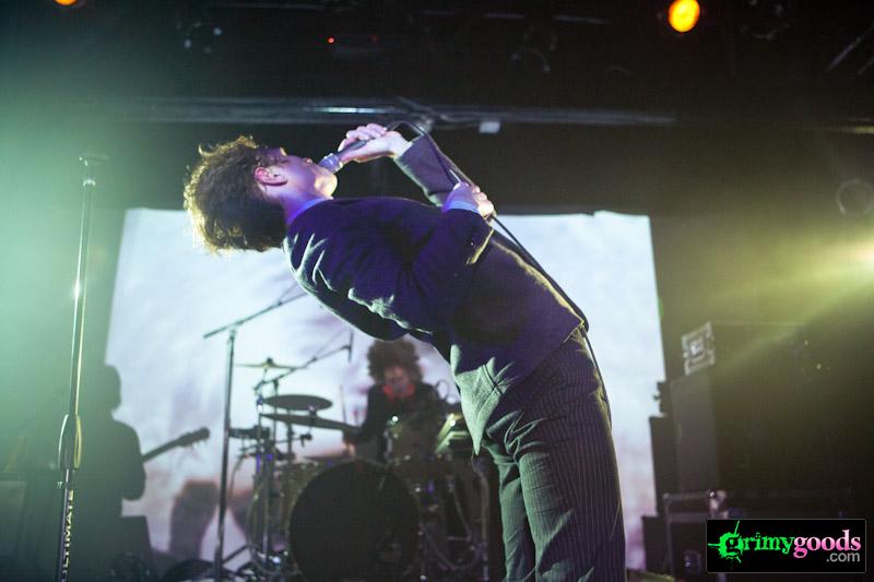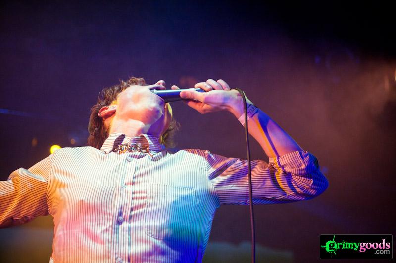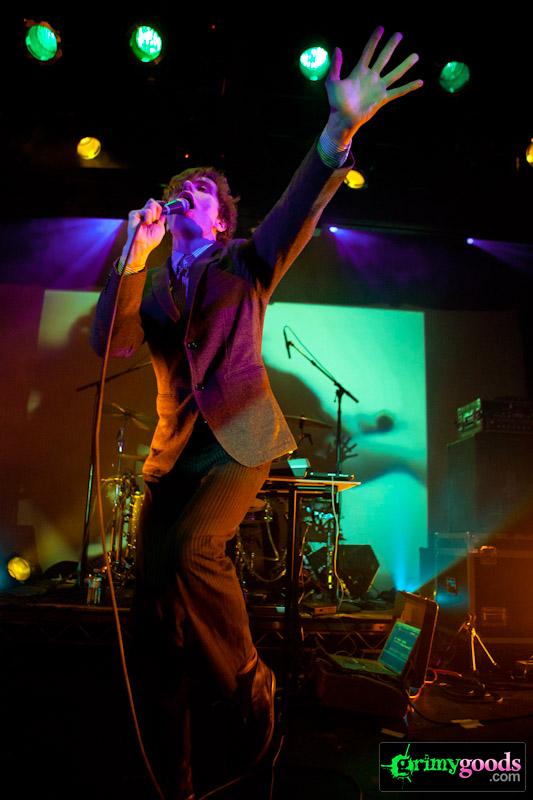 Supporting Los Campesinos! were the endlessly engaging Parenthetical Girls (see previous live review). The were a stellar complement and really got the crowd pumped up for an interesting, weird and wild evening of dancing. Where else can you see a band practically swallow a mic whole (see photo below).