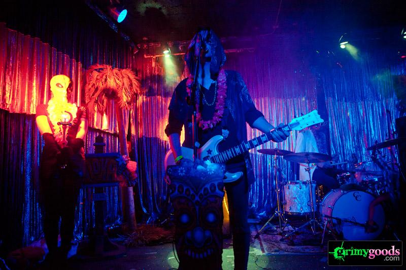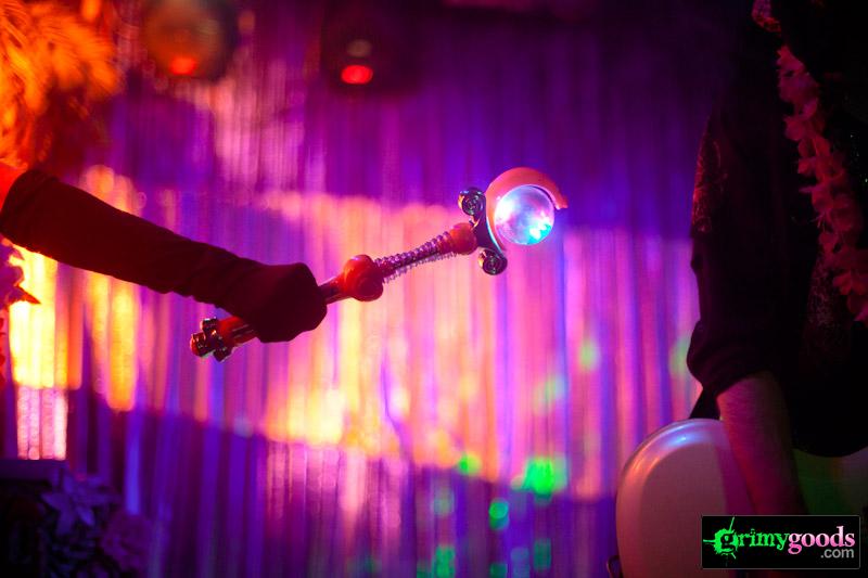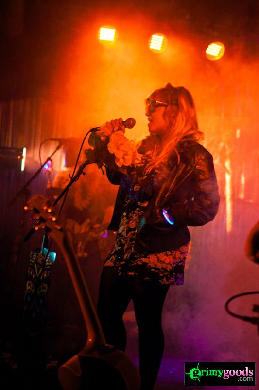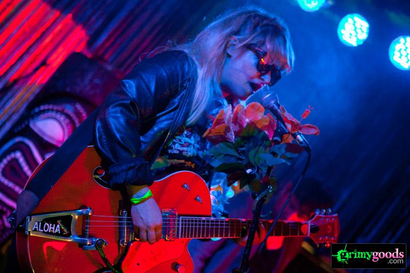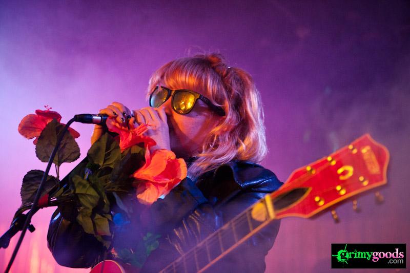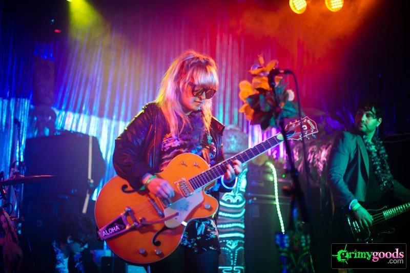 Opening up with all the weirdness and mystique you would find in the early days of the Sunset Strip, Magic Wands were tastefully obscure as guitarist, Chris had his face concealed with a psychedelic scarf draped around his head while font-woman, Dexy was sporting her retro shades. Opening up with a go-go dancing femme extraterrestrial (possibly from Venus), Magic Wands also added to their eccentric ambiance with smoke machines. As soon as the adorable “Teenage Love” came into play, Dexy shined like a young Debbie Harry especially when she started bustin’ her sultry brief verse of spoken-word. Bringing forth an unexpected treat, Dexy pulled our her harmonica for a blues-esque intro to the tripped-out I-wanna-take-some-LSD track, “Treasure.” Fans as well as myself seemed to enjoy her brief harmonica skills. Going into the flirty song, “Kiss Me Dead” (not to be confused with Generation X’s “Kiss Me Deadly”), the live performance of this song wasn’t up to par with the recording. Unfortunately, the bass and reverb flooded out Dexi’s vocals. You could barely make out what she was saying. Regardless, the drunken hippies and hipster swayed on, shining on like the crazy diamonds that they are.