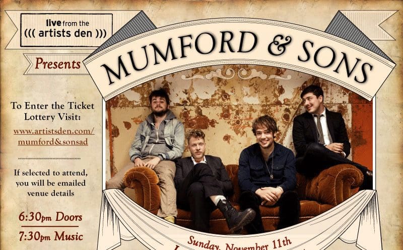 In support of their sophomore album, Babel, Mumford & Sons are celebrating in Los Angeles with a secret show presented by the Artists Den. This invite-only performance will take place at an undisclosed Los Anegeles location and the show will commence at 7:30 p.m. Want to score a pair of tickets? You can enter the ticket lottery for your chance to win. Just visit www.artistsden.com/mumfordandsonsad.
