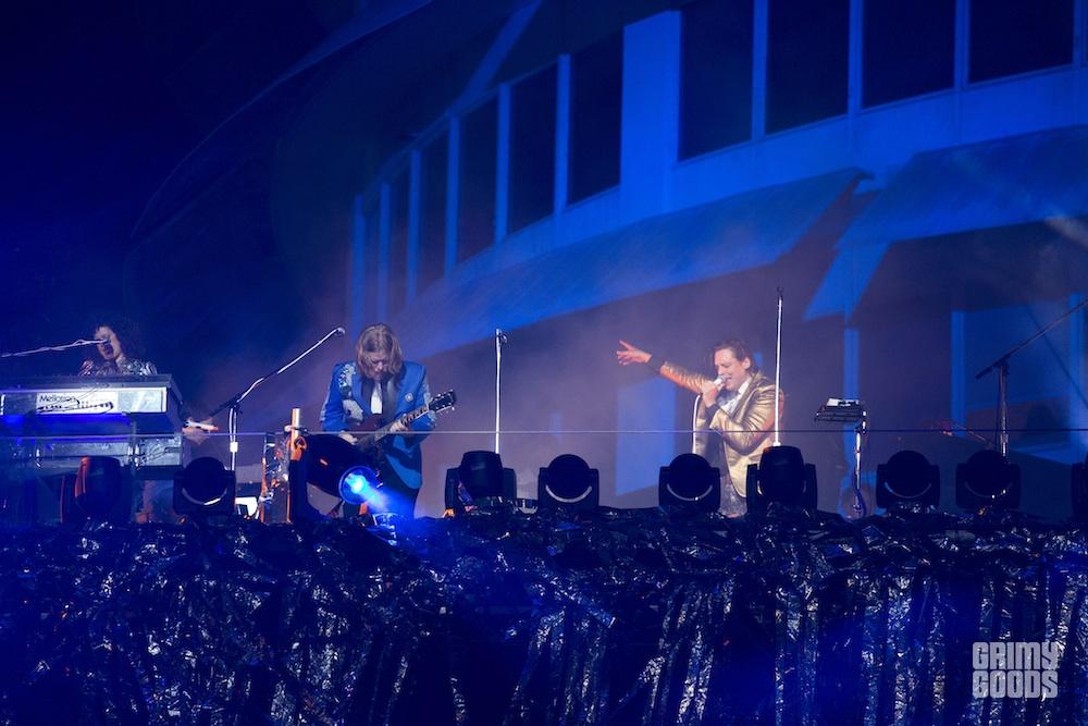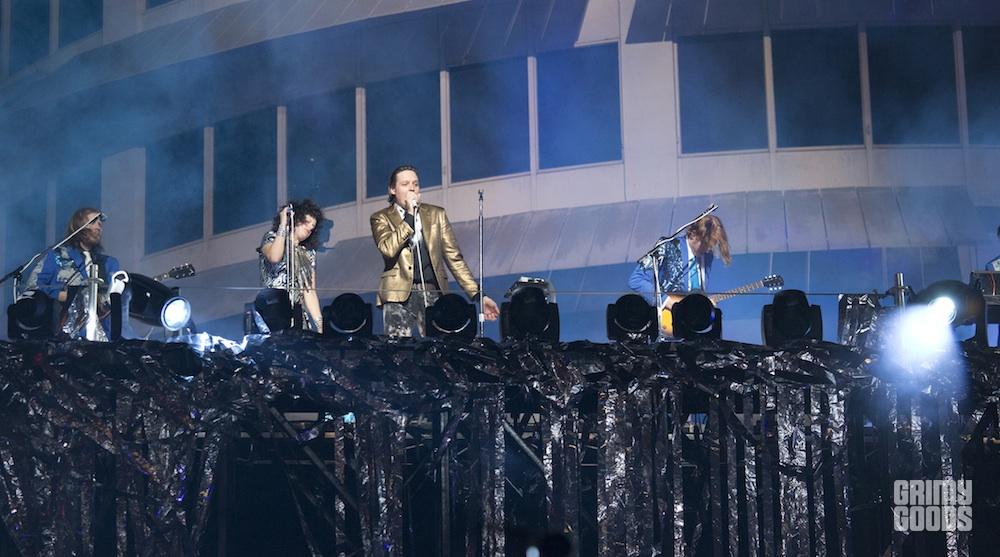 Kicking off with the sexy tribal beats of their new hit single, “Reflektor,” Arcade Fire emerged above a 40 + foot stage, looking over Hollywood Blvd and onto a massive crowd of human reflectors.