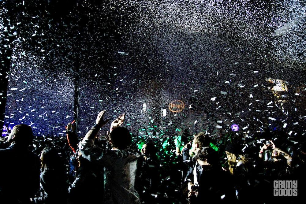 You can say that it snowed last night in Hollywood. As part of Arcade Fire’s highly anticipated “secret show” in Los Angeles, the Capitol Records parking lot had transformed into a shining wonderland of reflectors with fans dancing around in their best dazzling shining costumes as wind blowers erupted a gorgeous volcano of shimmering confetti into the sky. It truly looked as though Hollywood was experiencing a miraculous snowfall.
