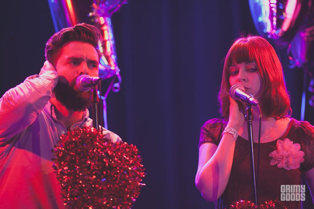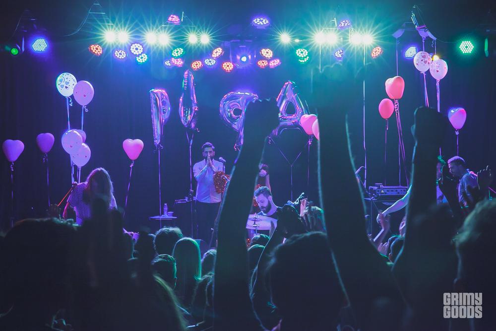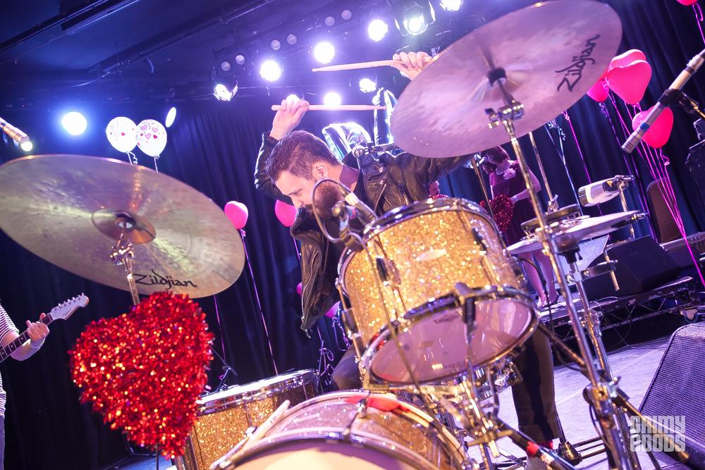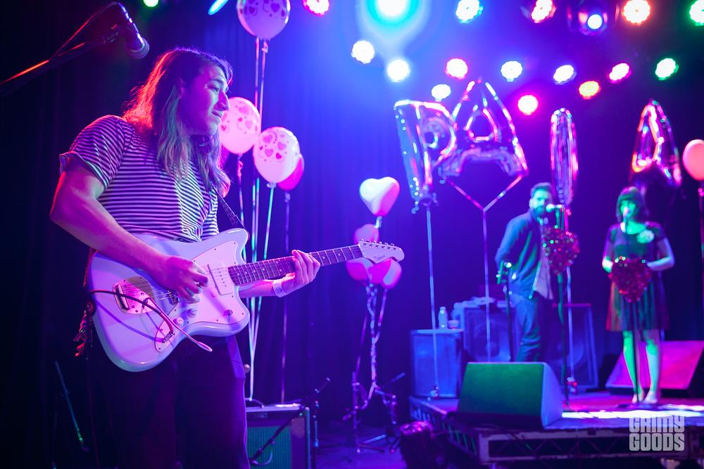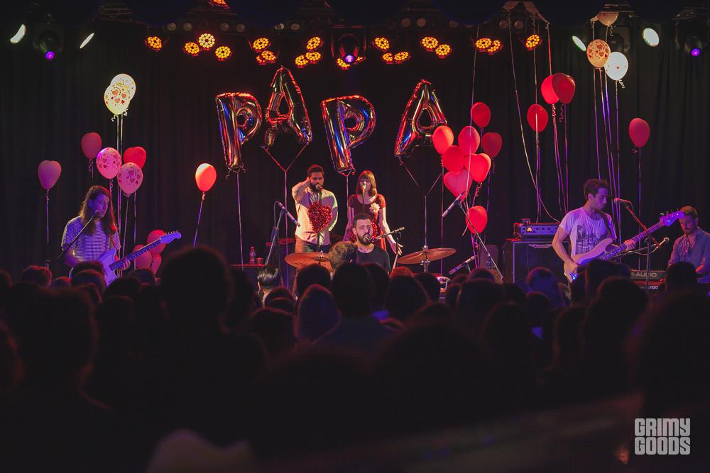 Ten o’clock came and went, the time in which the headliner was scheduled to play. The crowd didn’t seem to mind as they continued enjoying each other’s company and lips. Shortly after half past ten the notorious Roxy curtain rose to what seemed like the innards of a flagship Hallmark shop. Red and white heart-shaped balloons filled the stage alongside large glittery hearts. Behind the backing vocalists were four large flirting metallic balloons that spelled out “Papa.”