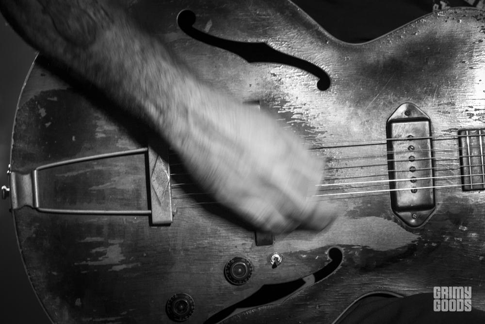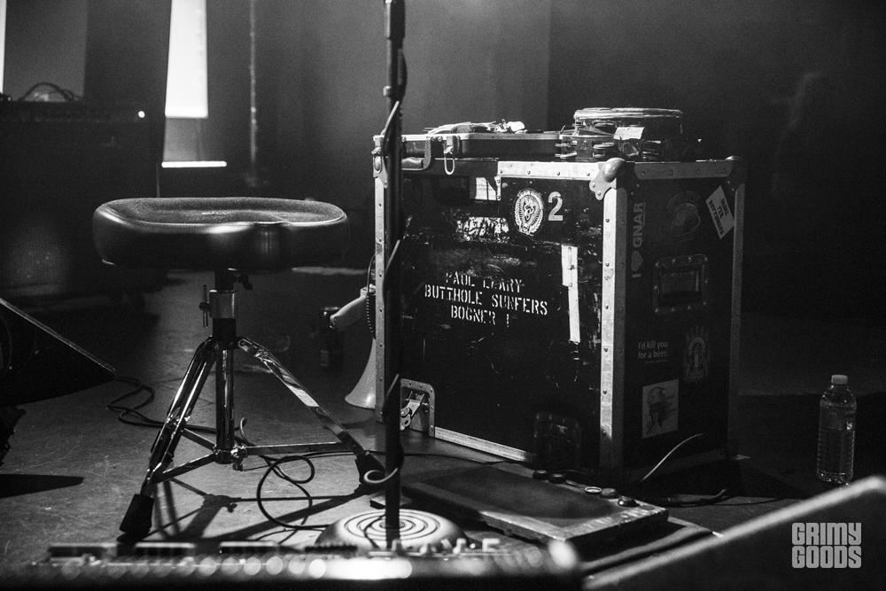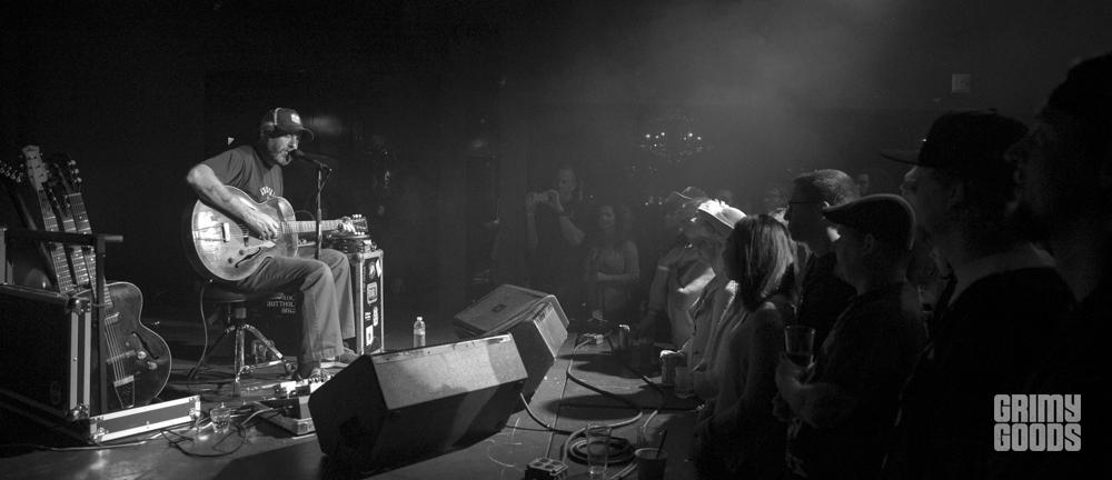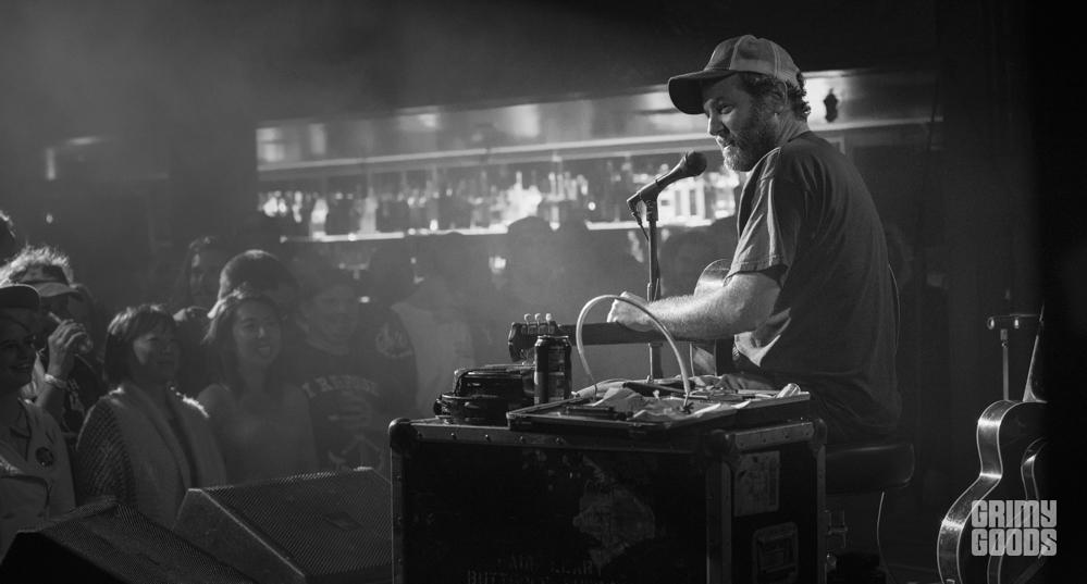 Scott H Biram was the headliner of the evening, he came out with his salt and pepper beard, Nike runner’s shoes and a trucker hat with a glass of whiskey on the ground and a can of Guinness on his tour case labeled Butthole Surfers. I’m not sure if he stole it or bought it from someone from that band but I’m going to say he stole it just to keep things interesting.