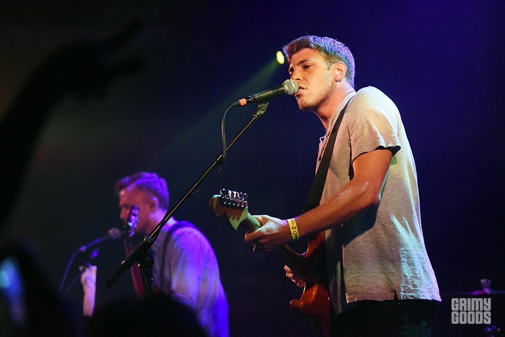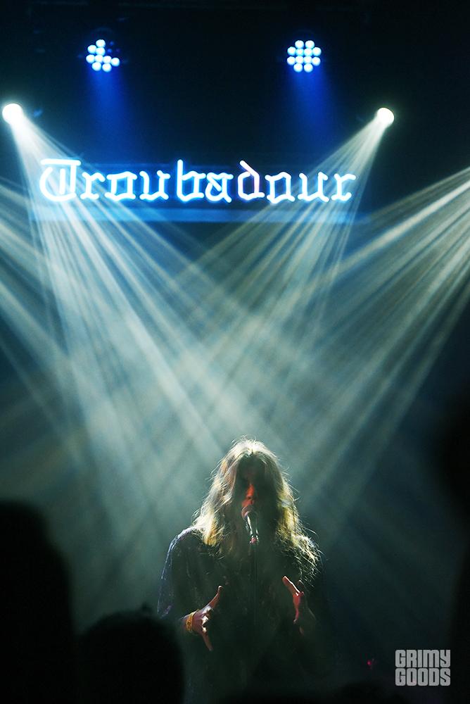 Show openers Foxtrax started the night with an overtly gleeful, thirty-minute montage of propulsive indie-rock tunes, powered seemingly solely by lead singer and guitarist Ben Schneid’s jubilant playing. Tangibly stoked about finding that he and his band were on an stage, playing for a packed house, Schneid bounced from heel to heel behind his microphone to the glittering guitar riffs that spun themselves around his juvenile croons. The band’s onstage chemistry was enough to break the mold of their, at times, formulaic alt-pop sound, yet the occasional dazzling moment from a twinkled keyboard melody or rare burst of synths, did more than allude to some hidden penchant for non-conforming indie tastes. Concluding every song with a jump kick, Schneid seemed to know his role as the warm-up act well, and entered into this endeavor with enough belly-burning gusto that the relative obscurity of their song’s lyrics by the crowd wasn’t even enough to dissuade him (at one point telling the crowd to “sing along” if they knew the words, which they didn’t, but his request was still met with a rallied enthusiasm). In truth, the authenticity of Schneid and company’s charming excitement, and no shortage of sweaty, throat-burning fervor, took the Troubadour’s early arrivers from a sea of head-bobbing zombies to a tangle of head-banging craziness. At just a little under a year-old, Foxtrax might still have a ways to go in honing their sound so that their peculiarities shine through their music as well as in their onstage personas, but the group’s live sound has all the raw, grimy potential that’s worth following up on later down the road.