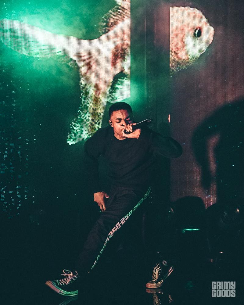 Long Beach rapper Vince Staples brought the Life Aquatic Tour to the Observatory in Santa Ana and dished out an energetic and visually stunning set. At 10pm sharp after a theatrical and bizarre performance from Kilo Kish the house lights dimmed and all eyes were on a giant panoramic split screen backdrop lit up with oceanic images. The beat dropped for “Prima Donna” and Staples slowly made his appearance.