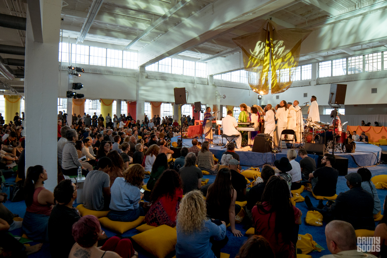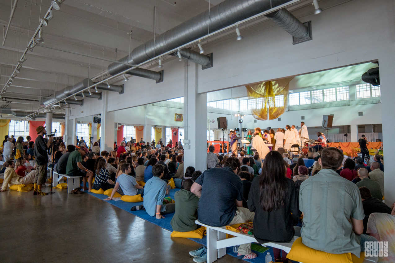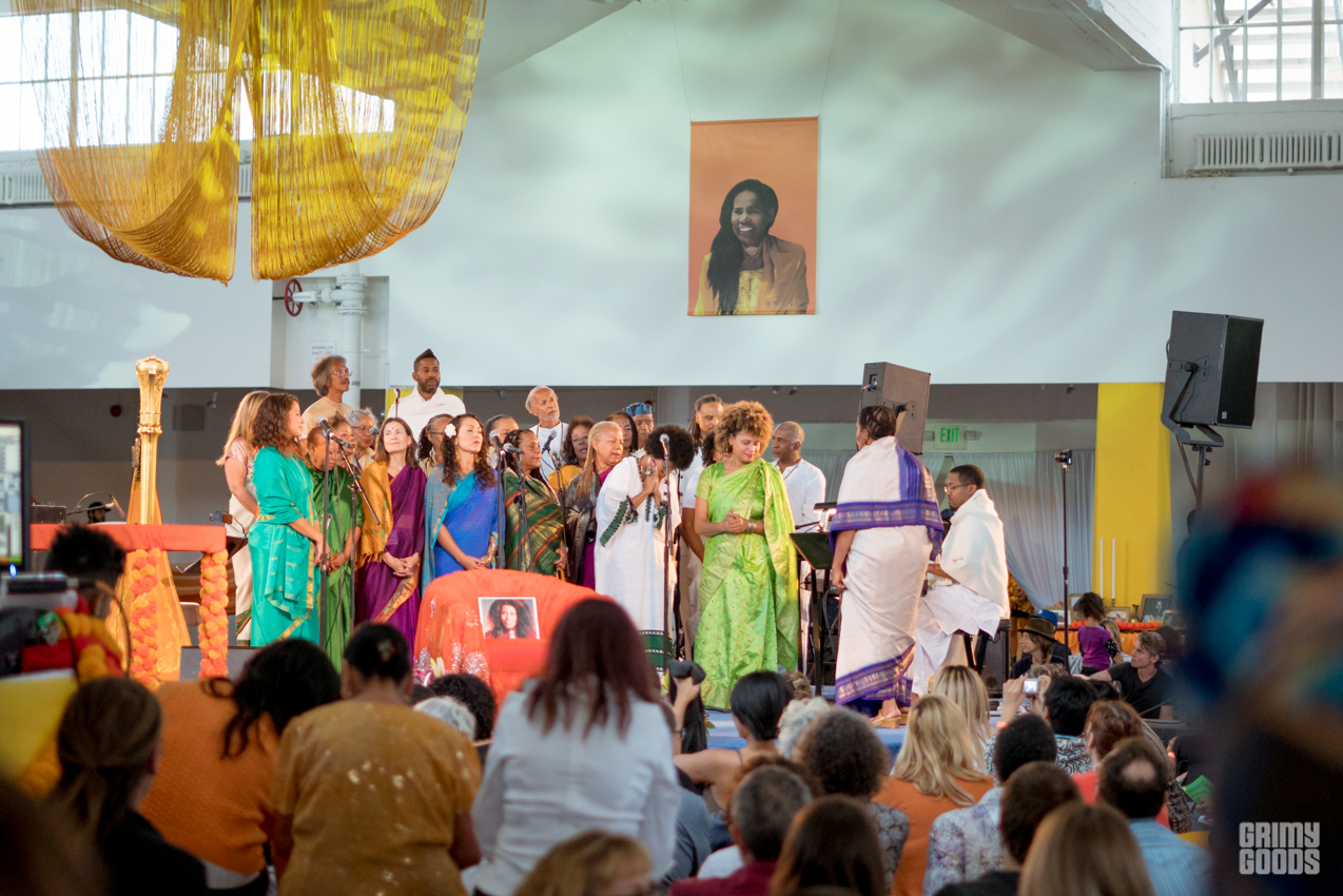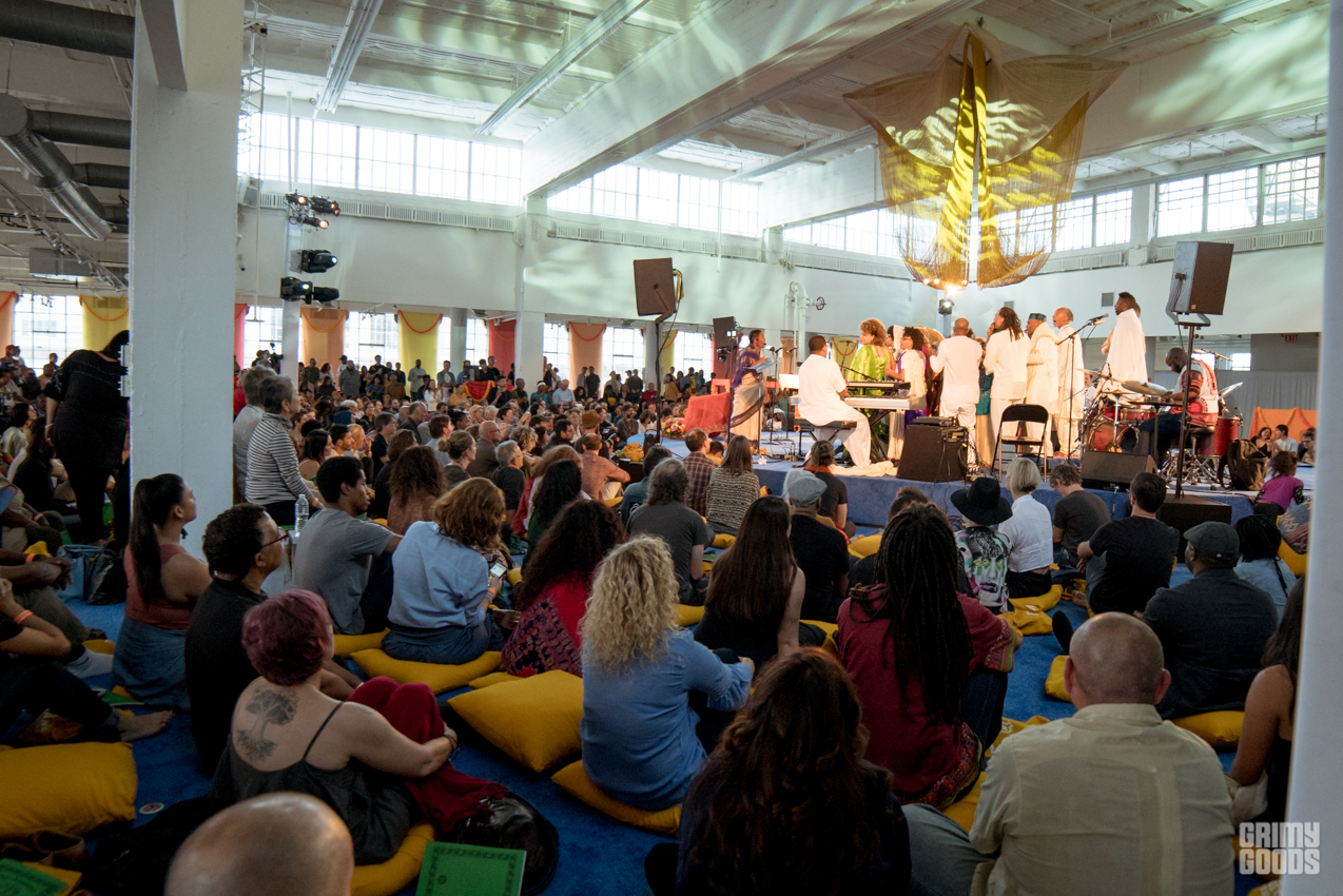 The event took place on the 11th floor of the Cooper Design Center in Downtown LA. If you missed the time to get the elevator, as I did, you had to go up the 11 floors taking the stairs. Once you caught your breathe and got up there, you were requested to remove your shoes to enter the space set up as a temple. Long gold and red curtains were placed by the large windows facing the city, and gold cushions were provided to some as seats. The performance featured the music that Alice Coltrane Turiyasangitananda wrote while living in her ashram / retreat outside of LA in the 80s, recently reissued by Luaka Bop. The Sai Anantam Singers, who lived with Alice in the ashram, accompanied by musicians led by Miguel Atwood Ferguson — reached that ecstatic feel proper of her world.