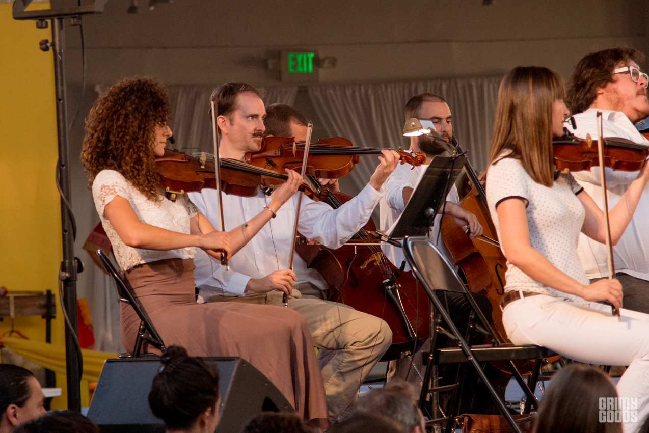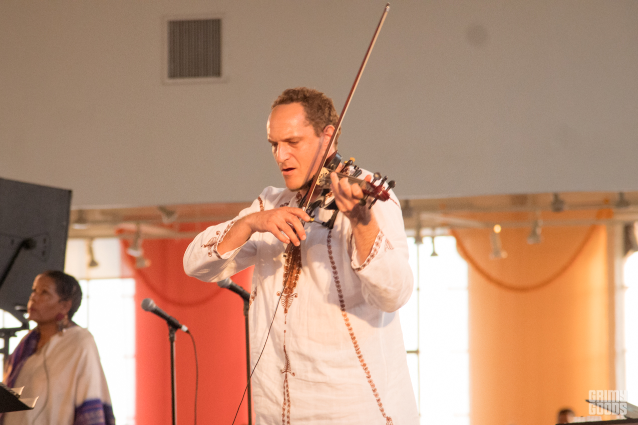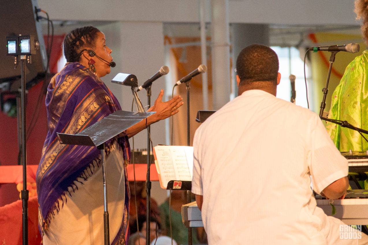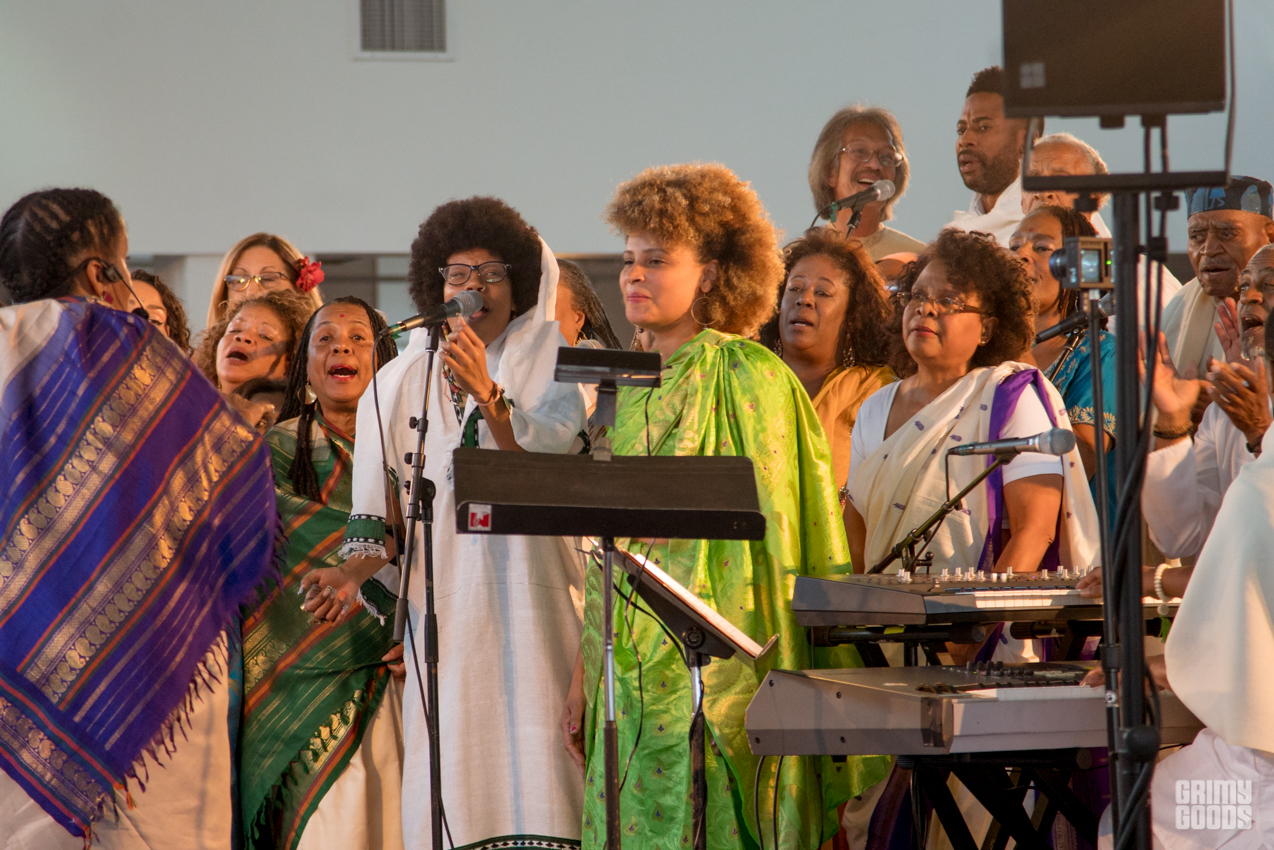 The event took place on the 11th floor of the Cooper Design Center in Downtown LA. If you missed the time to get the elevator, as I did, you had to go up the 11 floors taking the stairs. Once you caught your breathe and got up there, you were requested to remove your shoes to enter the space set up as a temple. Long gold and red curtains were placed by the large windows facing the city, and gold cushions were provided to some as seats. The performance featured the music that Alice Coltrane Turiyasangitananda wrote while living in her ashram / retreat outside of LA in the 80s, recently reissued by Luaka Bop. The Sai Anantam Singers, who lived with Alice in the ashram, accompanied by musicians led by Miguel Atwood Ferguson — reached that ecstatic feel proper of her world.