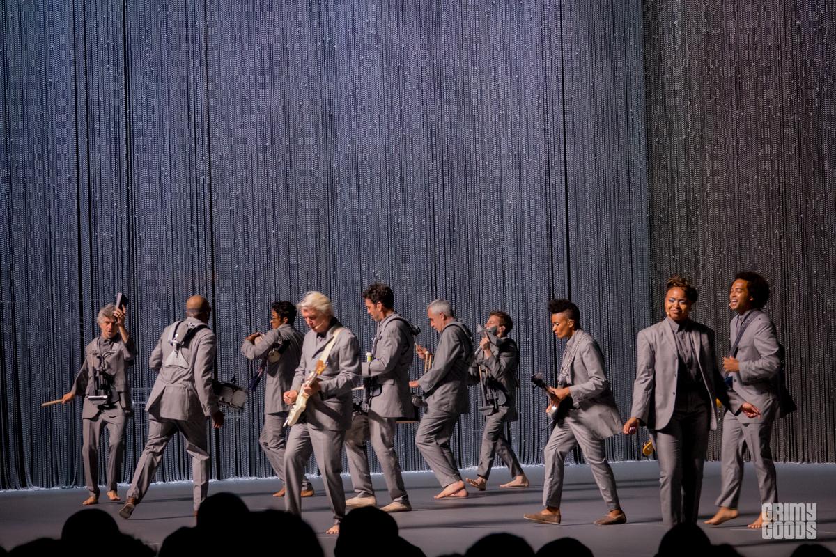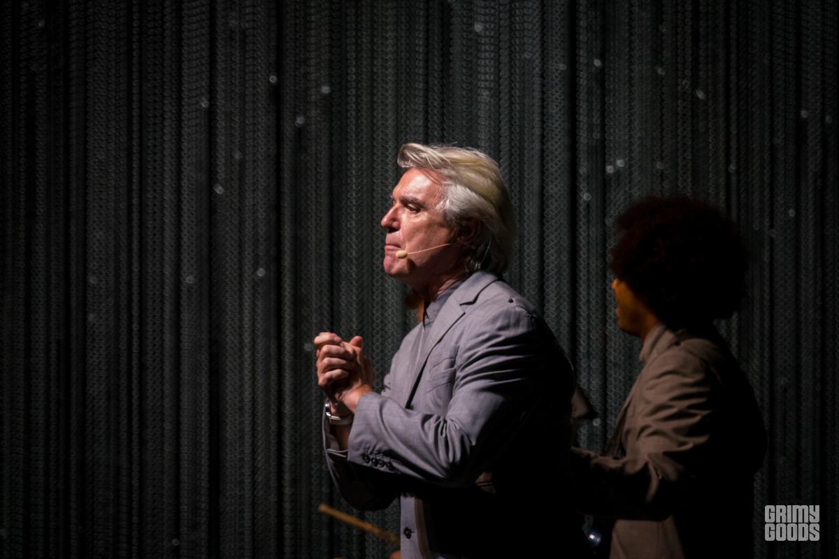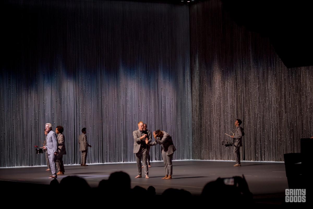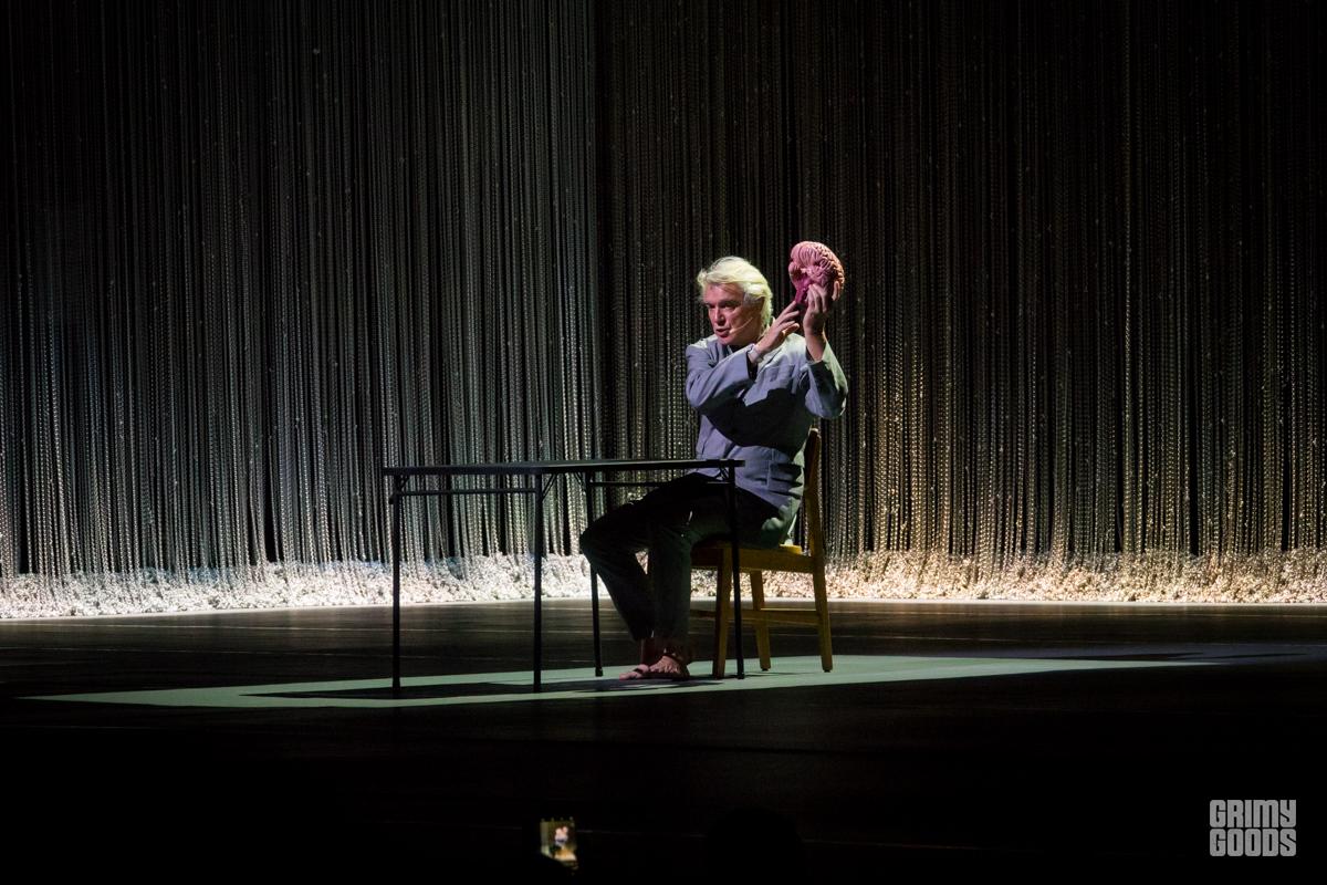 The stage was wrapped in curtains of beads forming three tall walls. A table with a brain resting on it and chair bathed in a square of light. From the darkness he appears like a barefoot professor, wild grey hair, grey suit. He is joined by his backup singers. Soon musicians are materializing through the walls. The lights a wash of blue or red. It is minimal. It is joyful. It is creative. It is shadow and light. It is human. It is David Byrne.