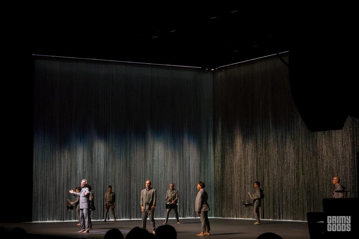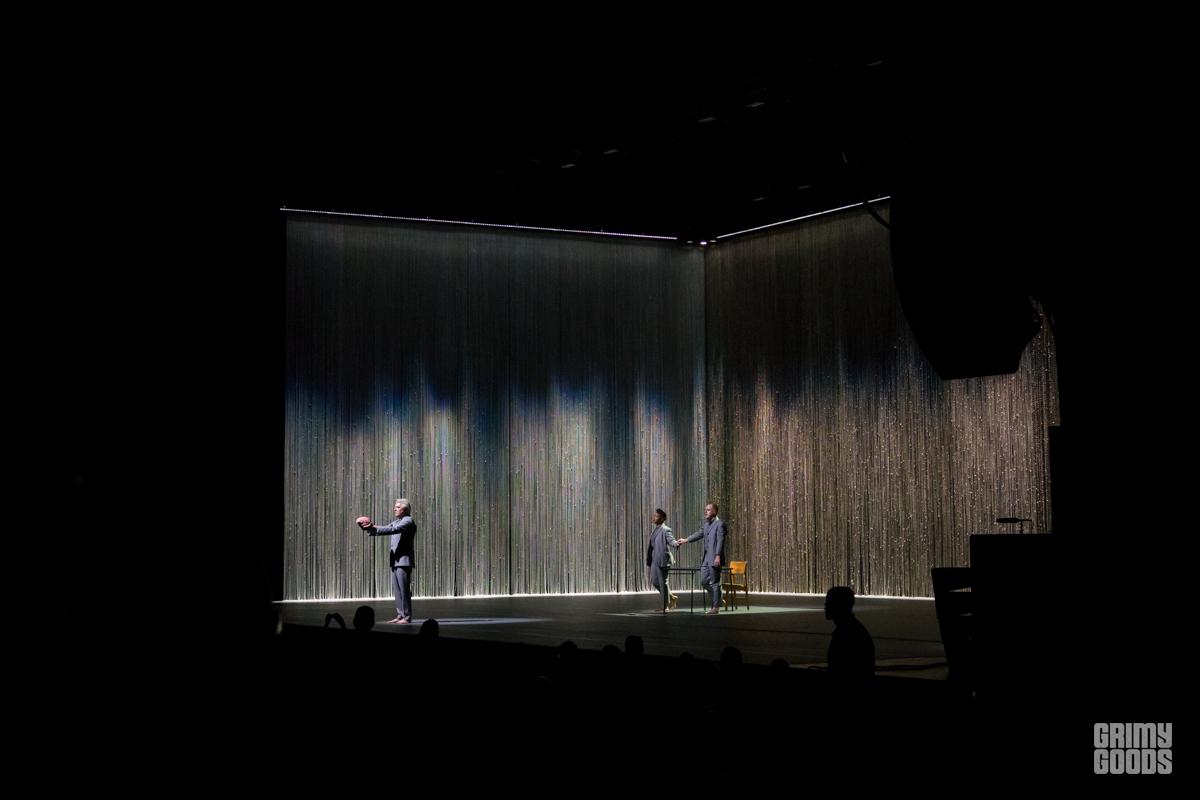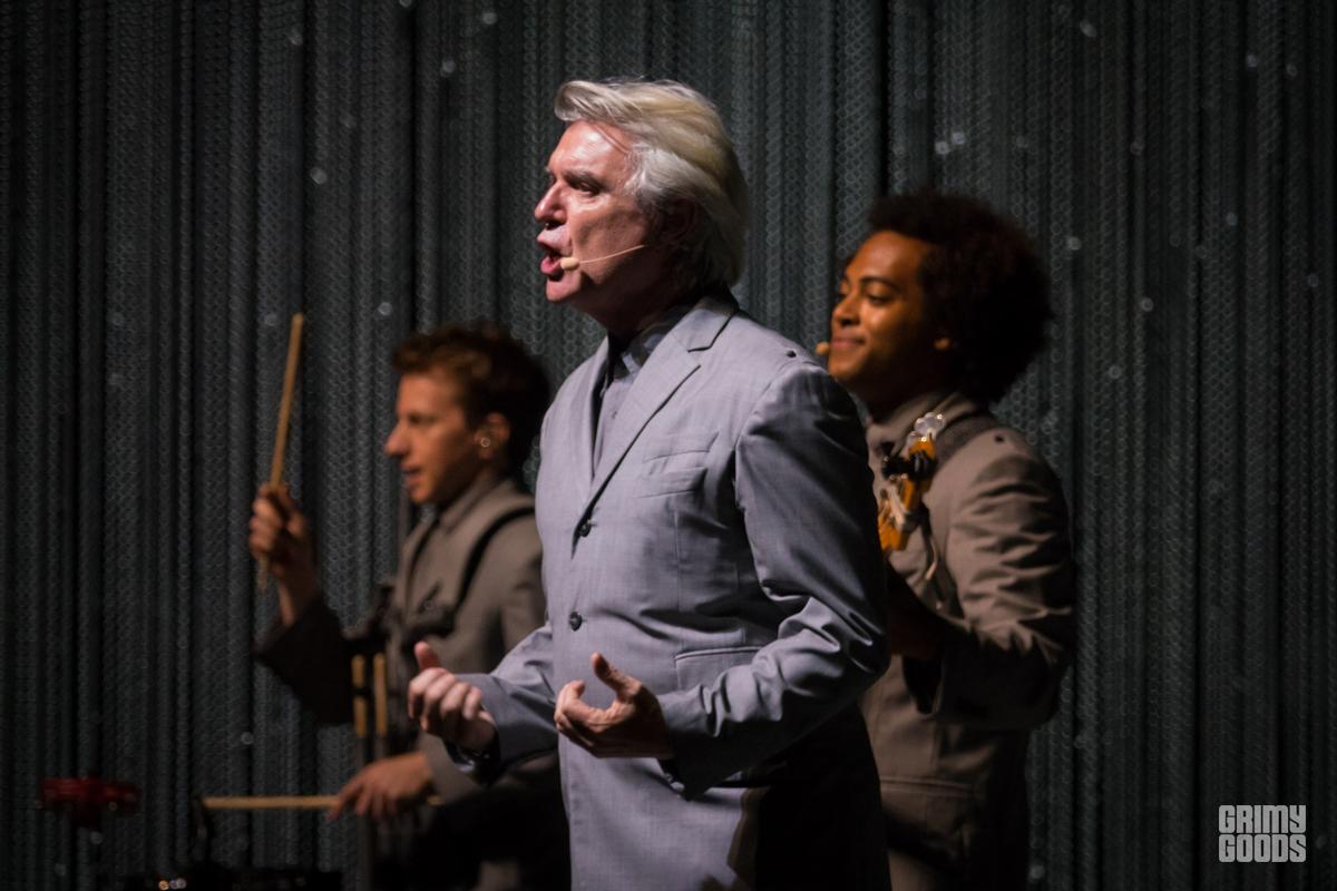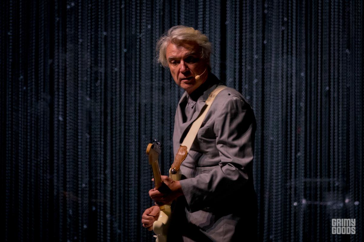 The stage was wrapped in curtains of beads forming three tall walls. A table with a brain resting on it and chair bathed in a square of light. From the darkness he appears like a barefoot professor, wild grey hair, grey suit. He is joined by his backup singers. Soon musicians are materializing through the walls. The lights a wash of blue or red. It is minimal. It is joyful. It is creative. It is shadow and light. It is human. It is David Byrne.