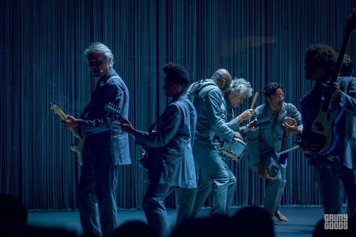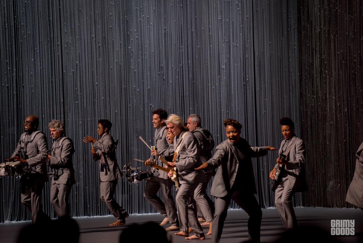 Byrne is joined by a variety of 11 musicians-two dancer/singers Chris Giarmo and Tendayi Kuumba, bass player Bobby Wooten, guitar player Angie Swan who played a blistering guitar solo during the second encore and Karl Mansfield on Keys. The rest were percussionists Gustavo Di Dalva, Daniel Freedman, Aaron Johnson, Tim Kieper, Mario Refosco and Davi Vieira.The troop exuded joy and community as they performed beautifully choreographed movements by Annie B Parson in minimal loose marching band like formations. Clearly Byrne’s series “Reasons to be Cheerful” is informing his work which is playful and yet meaningful with intense social commentary gift wrapped and delivered with a smile.