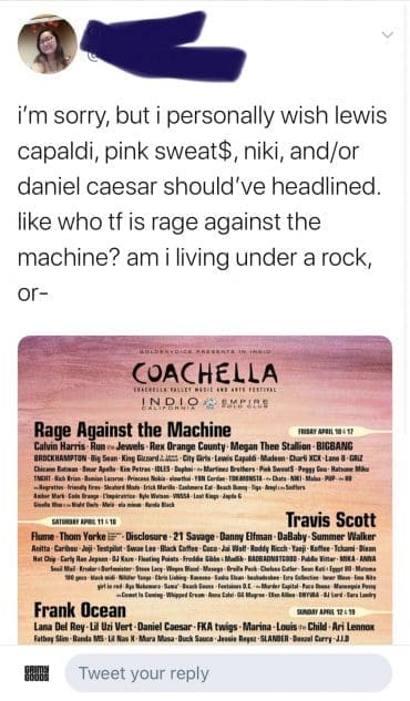 “i’m sorry, but i personally wish lewis capaldi, pink sweat$, niki, and/or daniel caesar should’ve headlined. like who tf is rage against the machine? am i living under a rock, or-“