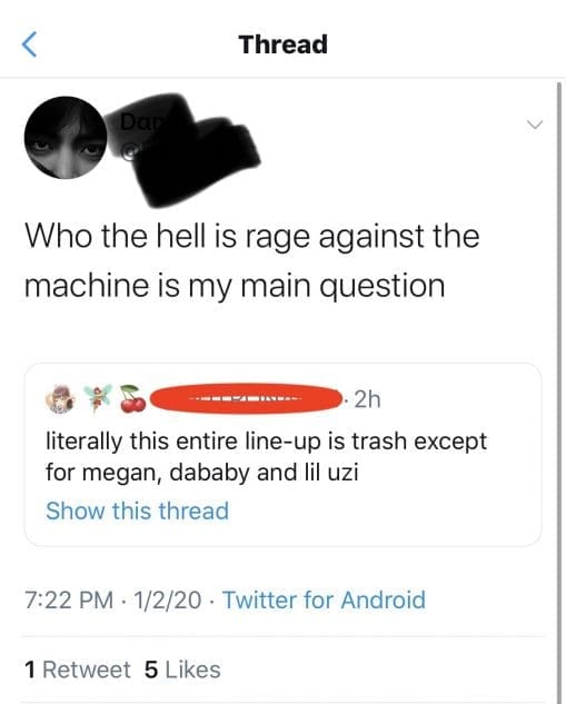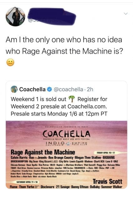“Lmao who is Rage Against the Machine and why are they a headliner. Just checked them out on Spotify and they’re certified whack”
