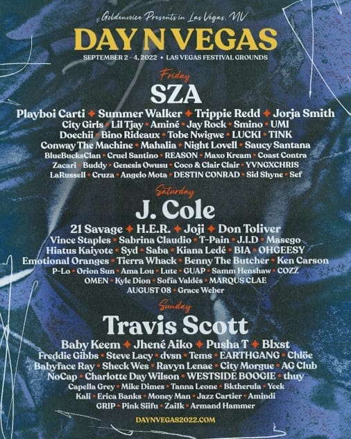Day N Vegas announces their third edition festival dates featuring SZA, J.Cole, Travis Scott, H.E.R, and more. Day N Vegas music festival will take place at the Las Vegas Festival Grounds September 2-4, 2022 (Labor Day Weekend). Organized by Goldenvoice, Day N Vegas debuted in 2019, but prior there was a very similar Day N Night festival … Headliners for this year’s Day N Vegas music festival include SZA., J. Cole, and Travis Scott. This year’s lineup includes a wide range of new and established artists who are pushing the boundaries of hip-hop and R&B, including Jhene Aiko, Jorja Smith, Syd, Ravyn Lenae, Amindi, Kali, Joji, Steve Lacy, Charlotte Day Wilson, and more.