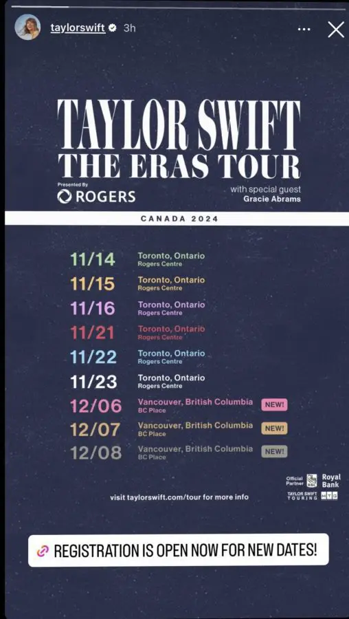Canadian Taylor Swift fans have a lot to be excited about today. The biggest pop star in the world, Taylor Swift, has added three new tour dates to the Canadian leg of The Eras Tour. Taylor Swift will perform on Dec. 6, 7, and 8, 2024, at the BC Place in Vancouver, B.C. The announcement arrived on Thursday morning via her social media. Ticket registration is now open.