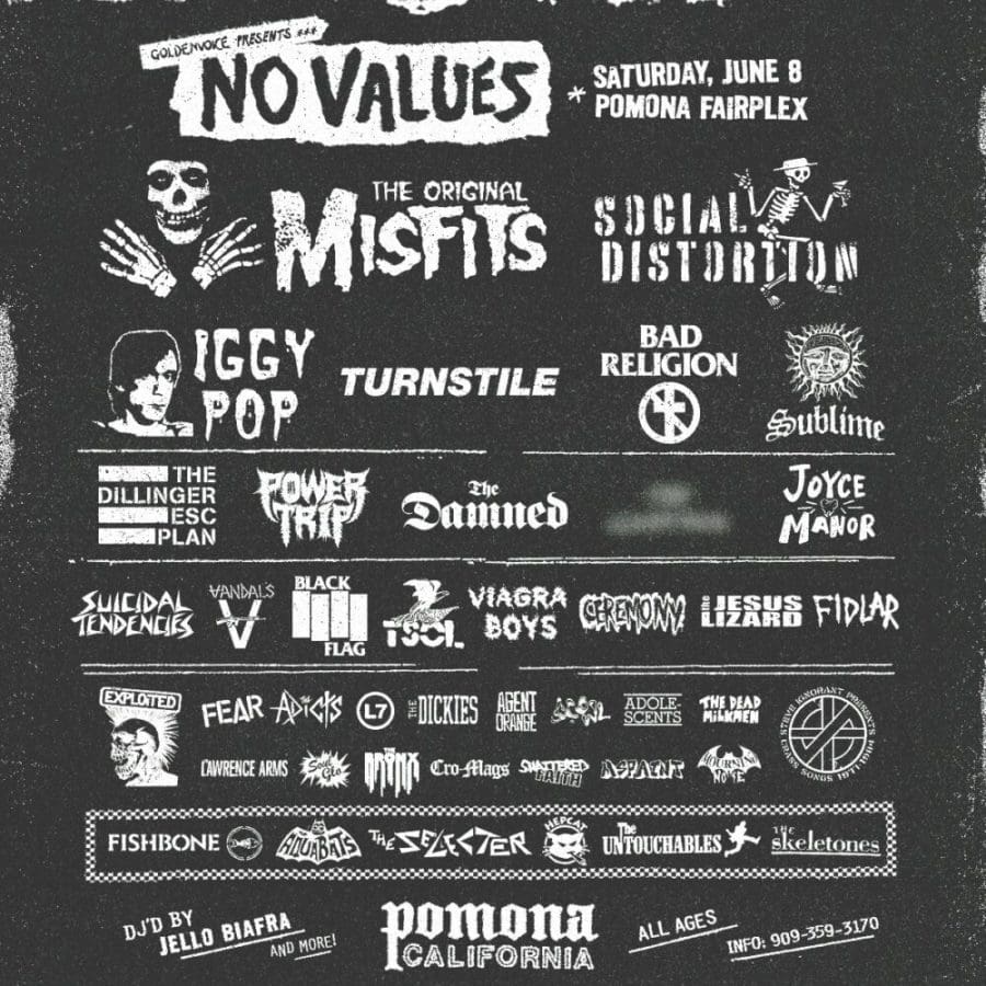 The punk crowds get the nostalgic treatment with the announcement of NO VALUES — a gathering of monoliths new and old that will converge on the hot pavement of the Pomona Fairplex this summer. Given this is its first year the lineup is an unsurprisingly stacked affair, featuring The Original Misfits, Social Distortion, Iggy Pop, Turnstile, Bad Religion, Sublime, The Dillinger Escape Plan, Power Trip, The Damned, Joyce Manor, Suicidal Tendencies, The Vandals, Black Flag, and more.