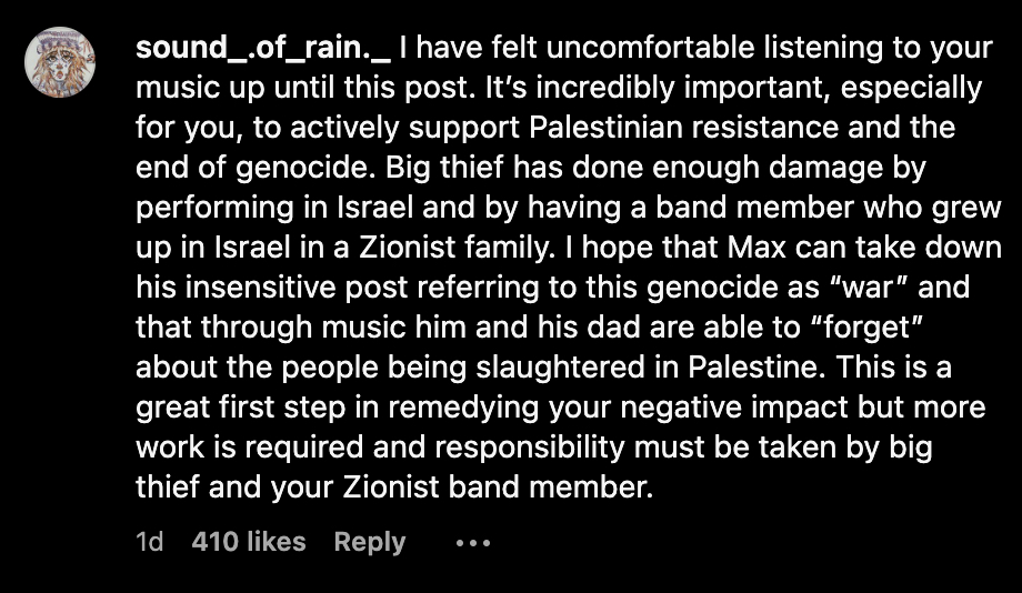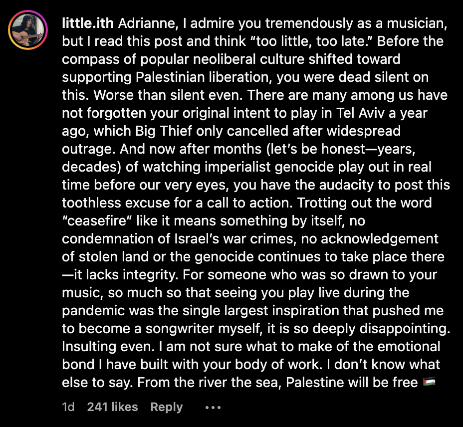 For some, her calls for a ceasefire are overshadowed by their belated arrival and the controversy that embroiled Big Thief back in 2022 when they pushed back against criticisms of their decision to perform in Tel Aviv. The band eventually canceled the concerts, and in a recent New York Times feature, Lenker referred to the debacle as the result of a “naïve and not thought out” perception they could play those shows without any backlash. She also admitted that the inner strife it caused within the band was enough to potentially cause a breakup.