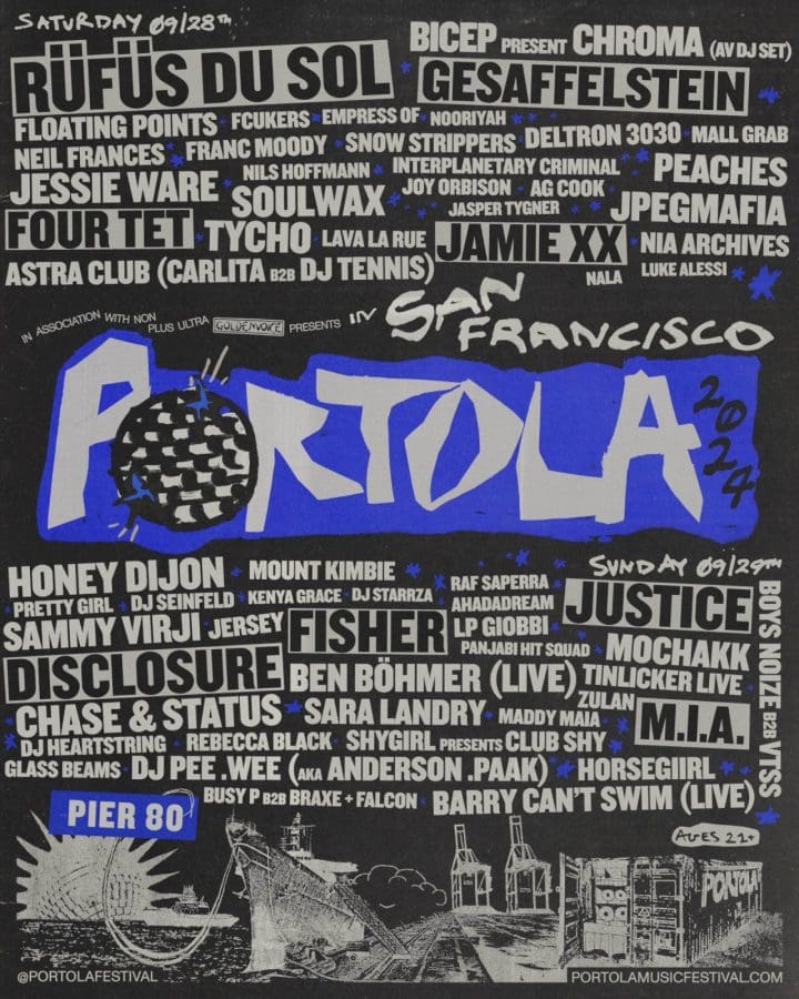 The 2024 Portola Music Festival will take place on Saturday, September 28, and Sunday, September 29, at Pier 80 in San Francisco, California.