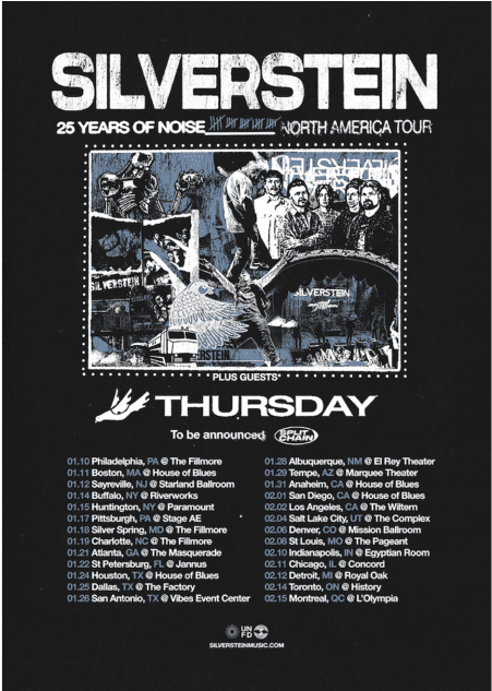 Silverstein have revealed details for their 25 Years Of Noise Tour. The Canadian rockers will celebrate their “silver” 25th anniversary with a set of tour dates that will take them through the U.S. including stops in Los Angeles at the Wiltern on Februrary 2, 2025, as well as a stop in Anaheim at the House of Blues on January 31. Additional Silverstein tour dates inlcude Philadelphia, Boston, Atlanta, Dallas, San Diego, Los Angeles, Denver, Chicago, Toronto (Canada), and more.