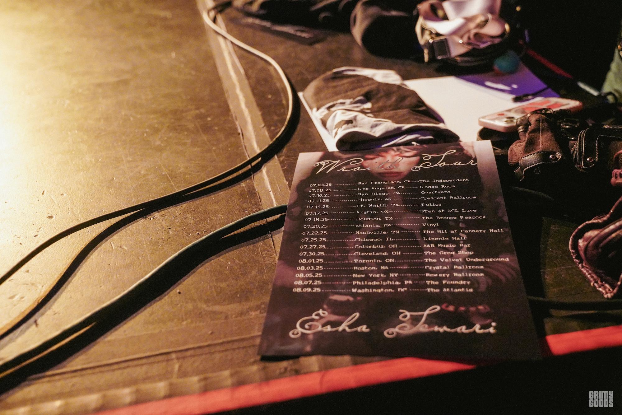 By 7:30 pm, half of the intimate venue is crowded with heavy bangs, shifting layered hairstyles, and Demonia platform boots; the air is thick with the scent of Summer Fridays lip gloss. Esha Tewari has sold out the Highland Park venue, which is hosting one of her two highly anticipated shows in LA. No problem; the next one is set for August 15 at the iconic Fonda Theatre. The current year is 2025, but the Tewarians, her devoted fan club, are living their best Y2K lives, eagerly screaming out “Linger” by The Cranberries as they anticipate the soft-spoken opener with Olivia Newton-John bangs, Chrissy, to take center stage.