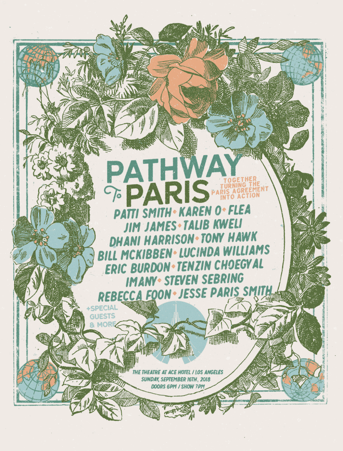 Pathway to Paris is now coming to the west coast. On September 16th, the Theater at the Ace Hotel will host the event, featuring guests like Patti Smith, Karen O, Jim James, Talib Kweli, Lucinda Williams, Flea, and other speakers and artists. This and the event in San Francisco two nights earlier will cap off the Global Climate Action Summit, which is meant to celebrate achievements for the climate action and to organize for continued action into the future.